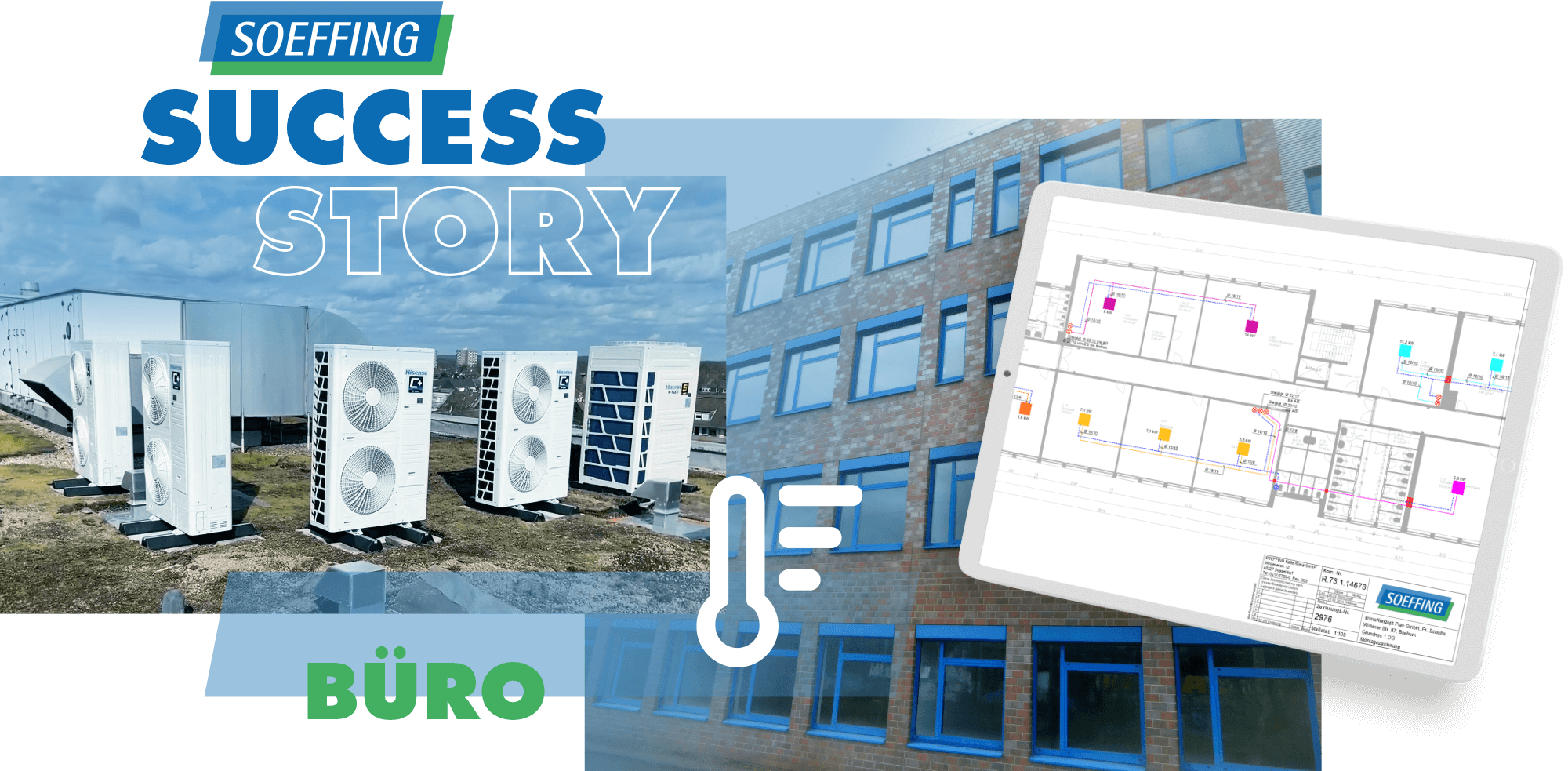 Für die Planung und Angebotserstellung wurde zunächst eine Kühllastberechnung durchgeführt. Für die Klimatisierung der Räume wurden insgesamt 93 Innengeräte (Deckenkassetten) und 16 Außengeräte installiert. Die Soeffing Kälte Klima GmbH hat die Montage der Geräte inklusive der Installation von 2350 m Rohrleitungen, 3250 m Kabel, das Erstellen einschließlich das brandschutztechnische Verschließen von Kernbohrungen, die Rohrnetzberechnung und die Dacharbeiten ganzheitlich koordiniert und ausgeführt. Die gesamte Montage wurde innerhalb von 5 Wochen abgeschlossen.