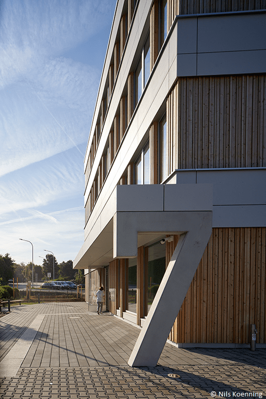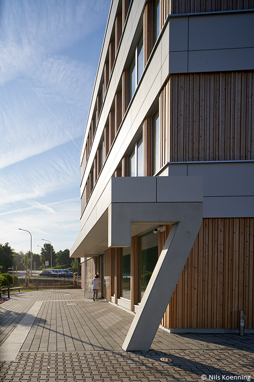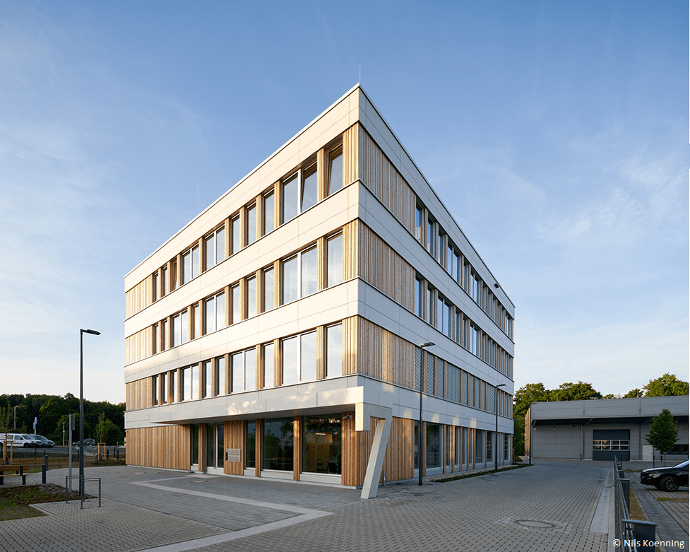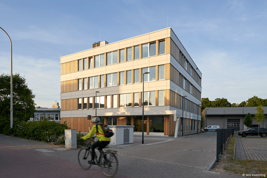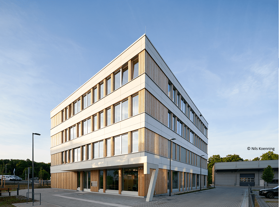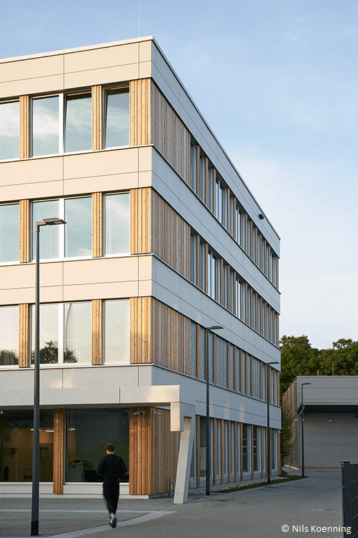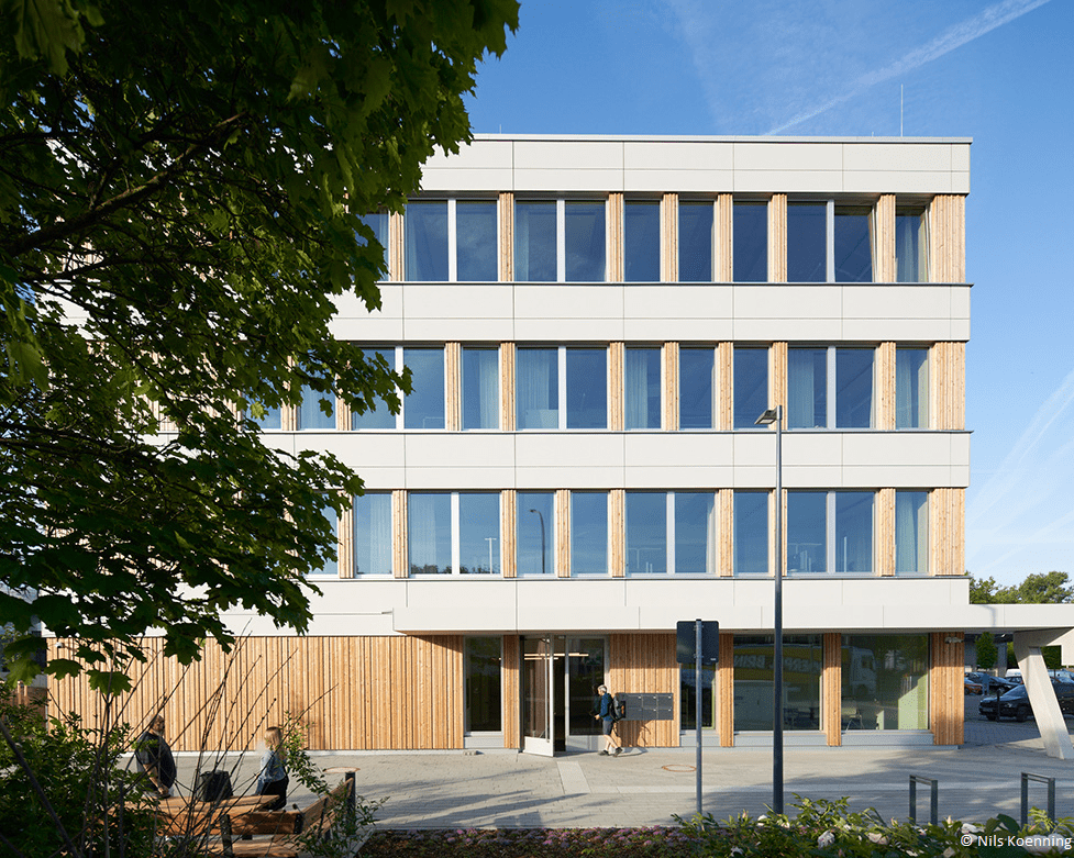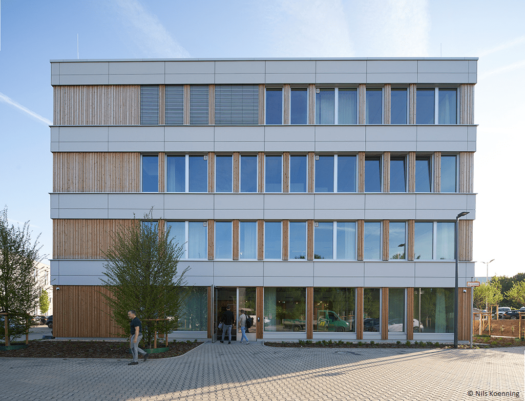 - Holzelemente-Fassade: Die vorgefertigte Vorhangfassade aus Holz unterstützt zudem eine klimafreundliche Bauweise.