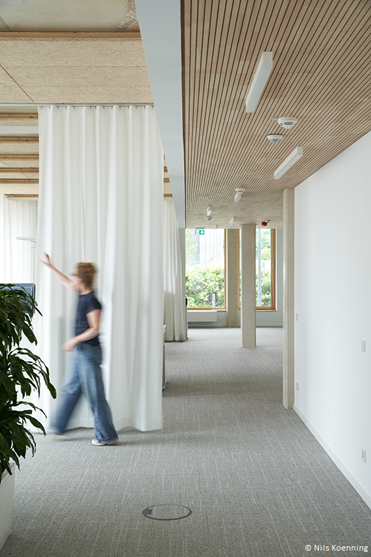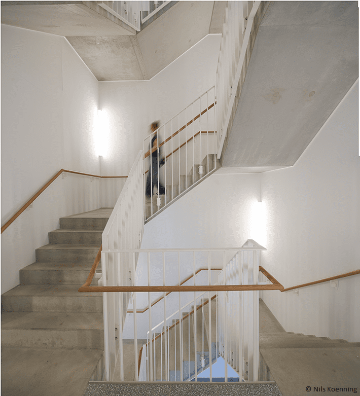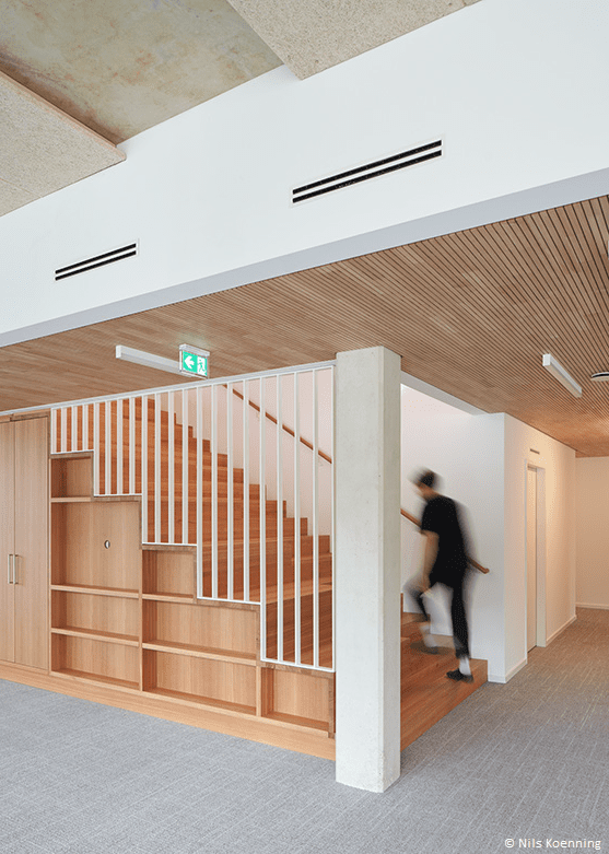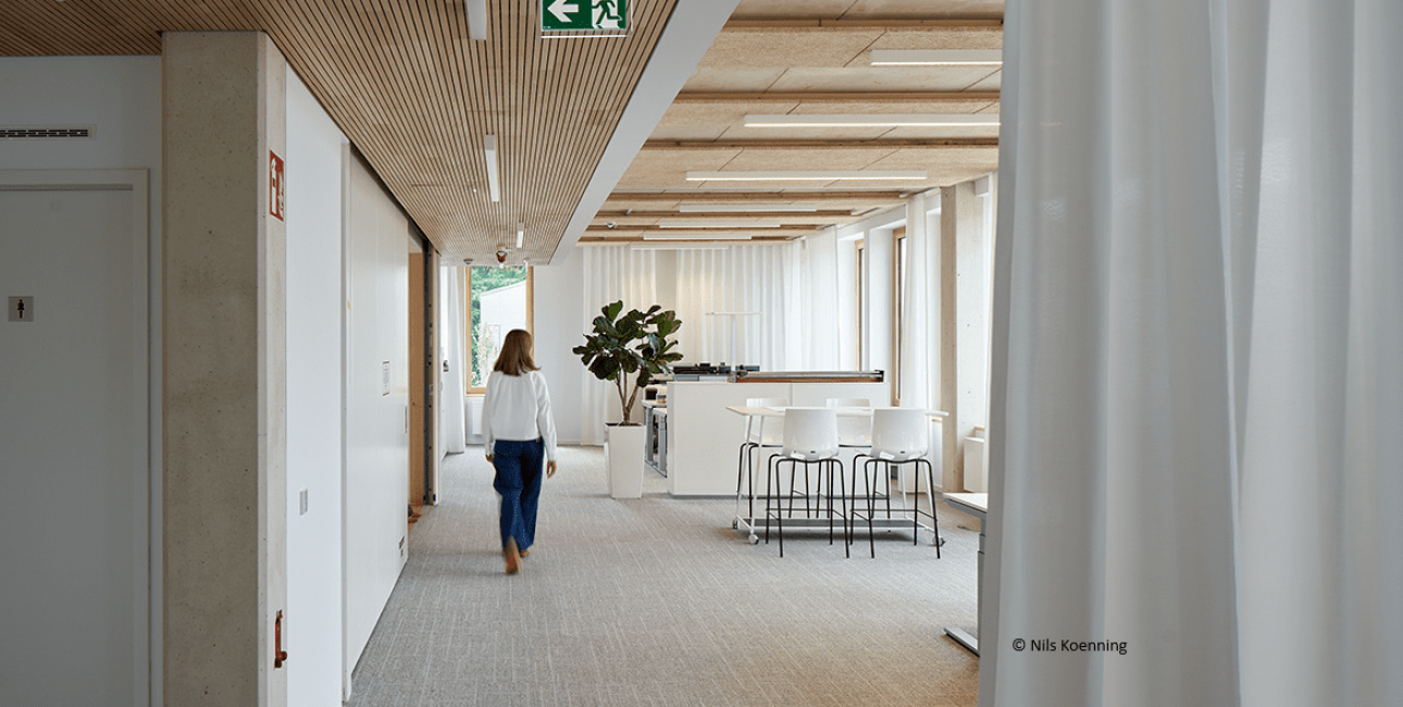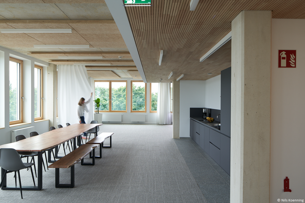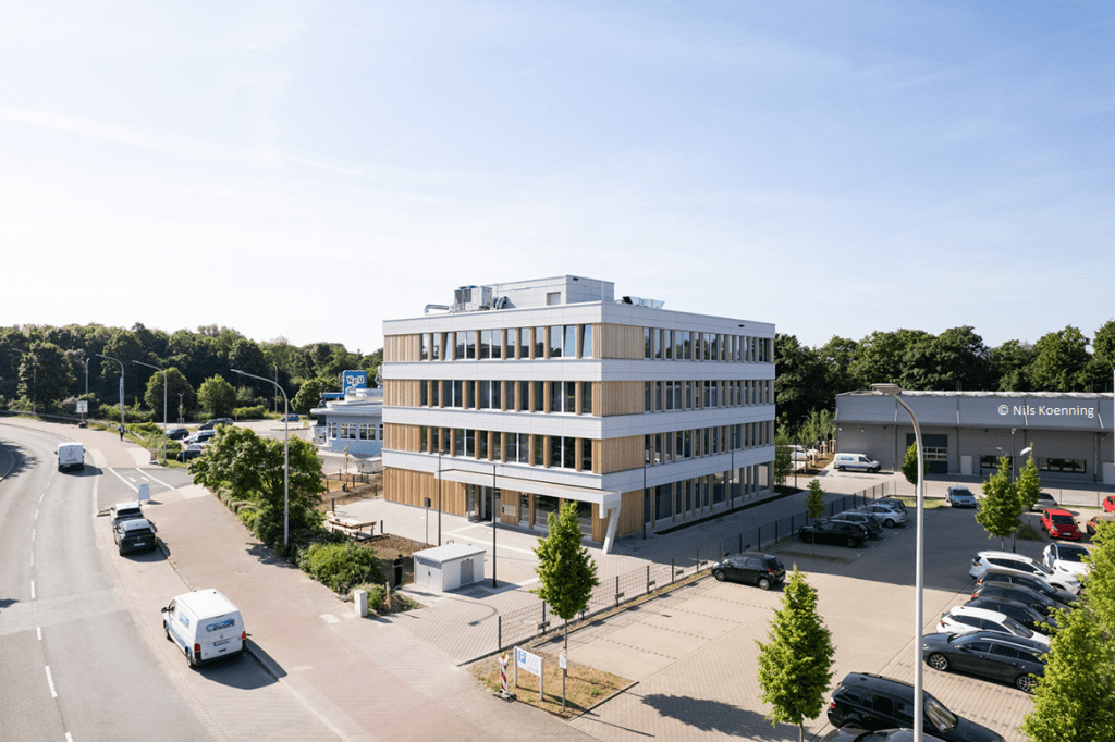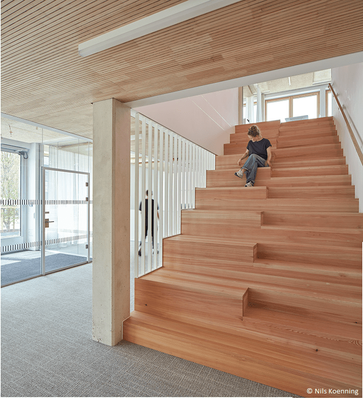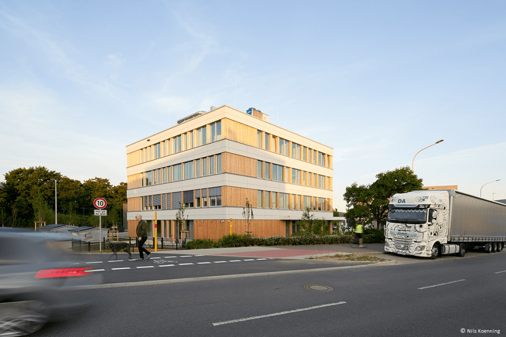- Holzelemente-Fassade: Die vorgefertigte Vorhangfassade aus Holz unterstützt zudem eine klimafreundliche Bauweise.